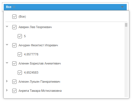 Параметр Показывать (Все) элемент включает опцию выбора всех значений в элементе Поле с деревом. Если этот параметр включен, то в элементе Поле с деревом будет присутствовать значение (Все), т.е. отметив флажком это значение, все значения этого элемента будут выбраны.