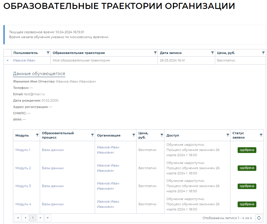 На странице размещается список всех образовательных траекторий данной организации с подробным описание данных обучающегося, а также данные законного представителя (если обучающийся не достиг 18 лет), выбранными им модулями, стоимостью обучения и статусом (доступом) к процессу обучения.