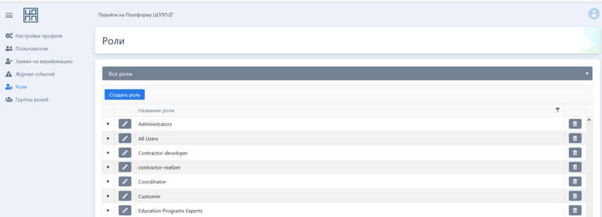 Во избежании некорректной работы системы рекомендуется не удалять системные роли с Платформы.