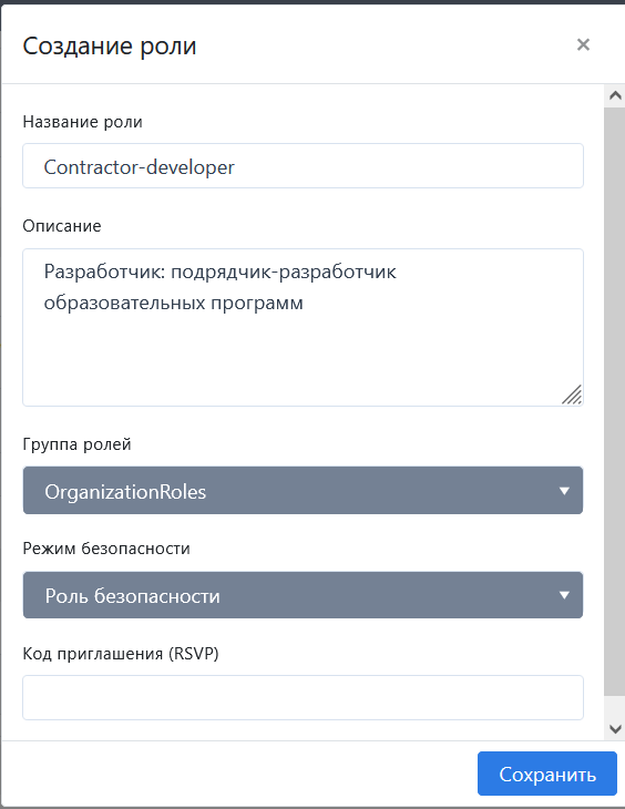 Окно редактирования информации о роли