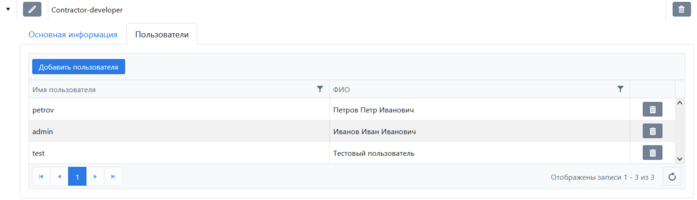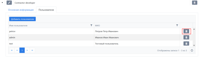 Для удаления добавленного к роли пользователя или самой роли, необходимо нажать на кнопку