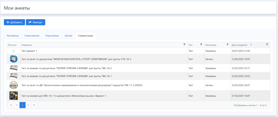 Для создания теста необходимо зайти в раздел Мои анкеты (ссылка на раздел находится в ниспадающем меню при нажатии на стрелочку рядом с отображаемым именем).