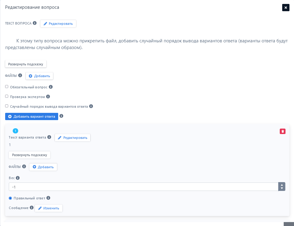 Правильный ответ – устанавливается как единственный правильный ответ.