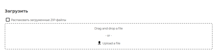 В появившемся окне нужно перетащить файлы в зону загрузки (прямоугольник выделенный пунктирной линией) либо щёлкнуть на зону загрузки для выбора файлов.