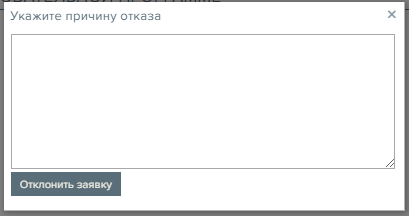 Для одобрения или отклонения заявки модератору необходимо нжать на соотвествующие кнопки . При отклонении необходимо указать причину отказа в появившемся окне.