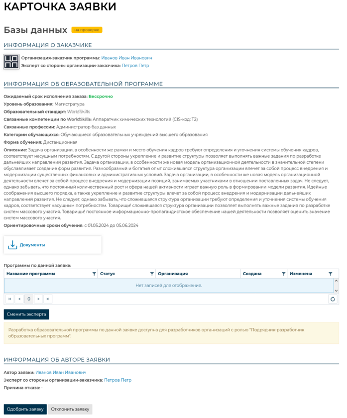 Для перехода на карточку заявки необходимо нажать на кнопку . На карточке заявки модератору доступна вся информация о заказчике, об образовательной программе, история изменений, а также информация о том, какие организации приступили к разработке программы по данной заявке.