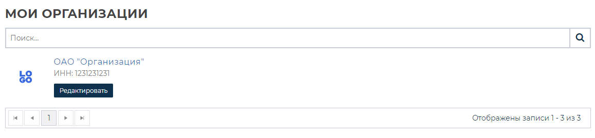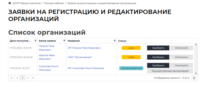 На данной странице Администратору и Модератору ЦОПП отображаются все организации, отправленные на проверку, в виде списка. Ссылка на страницу Заявки на регистрацию и редактирование организации располагается в меню личного кабинета