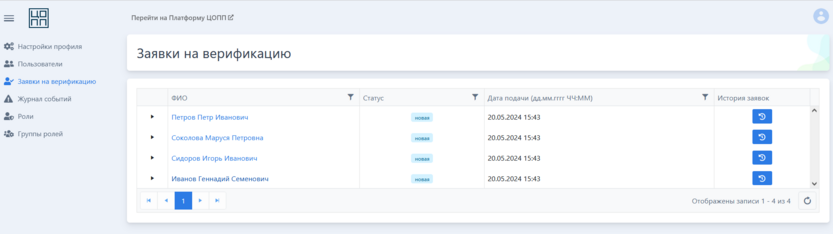 На открывшейся странице доступен список заявок на верификацию. На странице доступны сортировка и фильтрация.