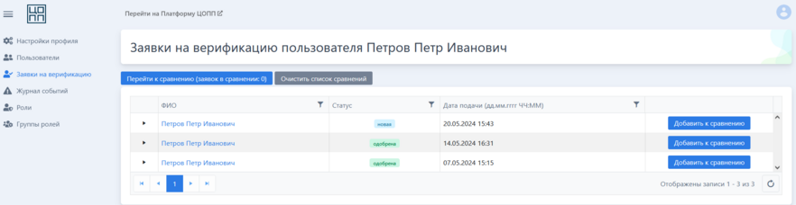 Сравнивать заявки можно только в том случае, когда пользователь подавал заявку на верификацию более одного раза.